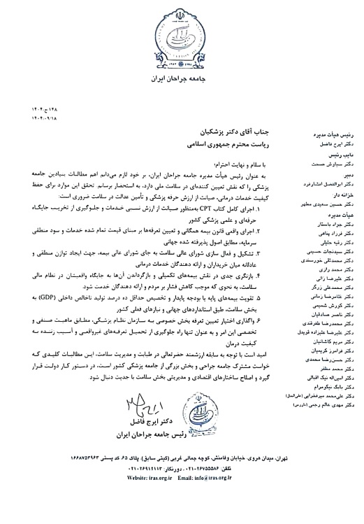 امید است با توجه به سابقه ارزشمند حضرتعالی در طبابت و مدیریت سلامت، این مطالبات کلیدی که خواست مشترک جامعه جراحی و بخش بزرگی از جامعه پزشکی کشور است، در دستور کار دولت قرار گیرد و اصلاح ساختارهای اقتصادی و مدیریتی بخش سلامت با جدیت دنبال شود.
