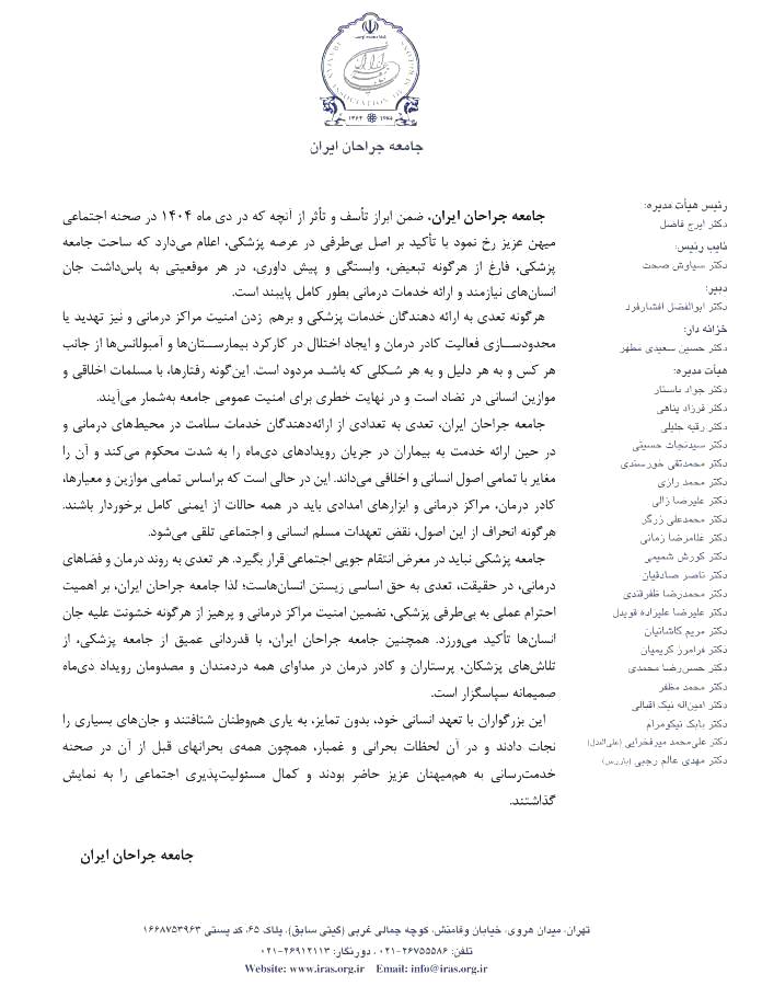 به عنوان رئیس هیأت مدیره جامعه جراحان ایران، بر خود لازم میدانم اهم مطالبات بنیادین جامعه پزشکی را که نقش تعیین کنندهای در سلامت ملی دارد، به استحضار برسانم. تحقق این موارد برای حفظ کیفیت خدمات درمانی، صیانت از ارزش حرفه پزشکی و تأمین عدالت در سلامت ضروری است: